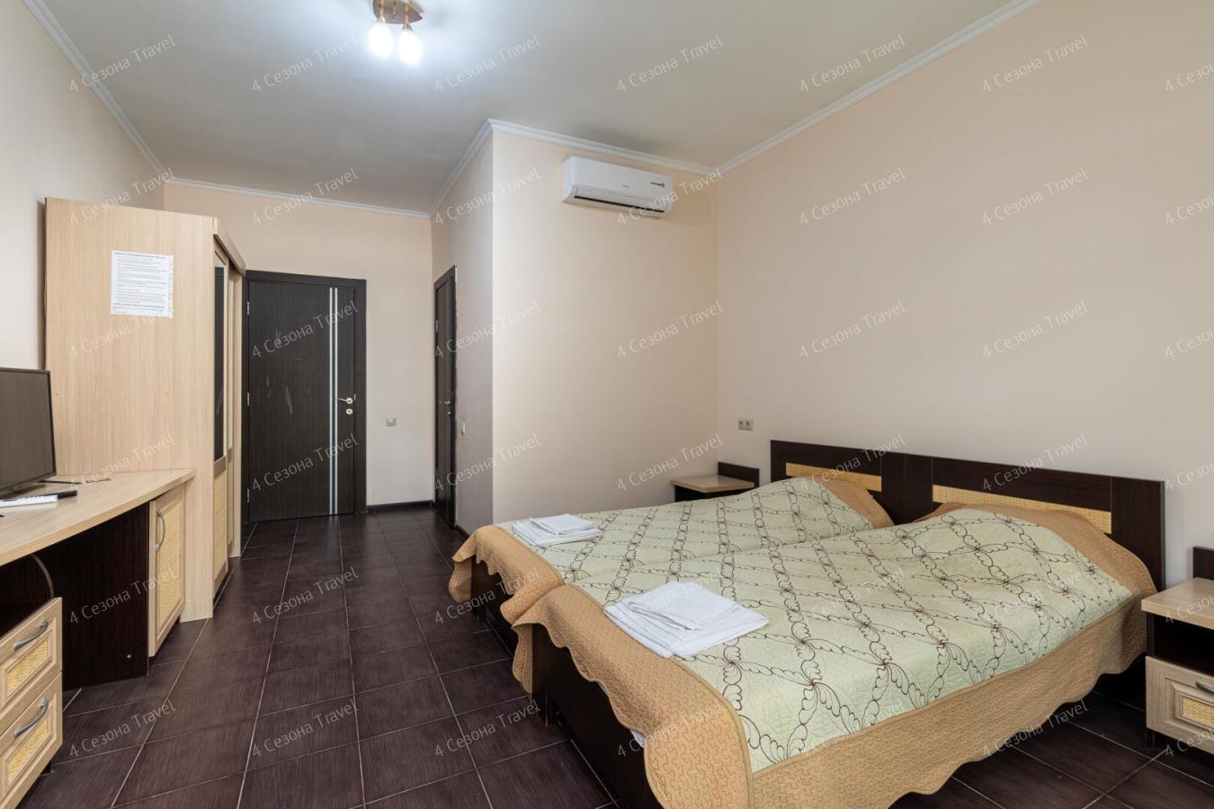 Дизайн гостиницы «Руслан» и ее территории отличается средиземноморским колоритом. Закрытый двор украшают фонтан, роскошные пальмы, уголки для отдыха и кафе. Отель работает сезонно и принимает гостей без возрастных ограничений – даже самых маленьких. Небольшие диваны в номерах легко превращаются в дополнительное место для размещения ребенка. Их же можно использовать как рабочий уголок – вместе с небольшим столом и двумя креслами. Кроме того, в каждом номере есть удобные кровати, телевизор, холодильник, кондиционер: это создает уют в любую погоду.