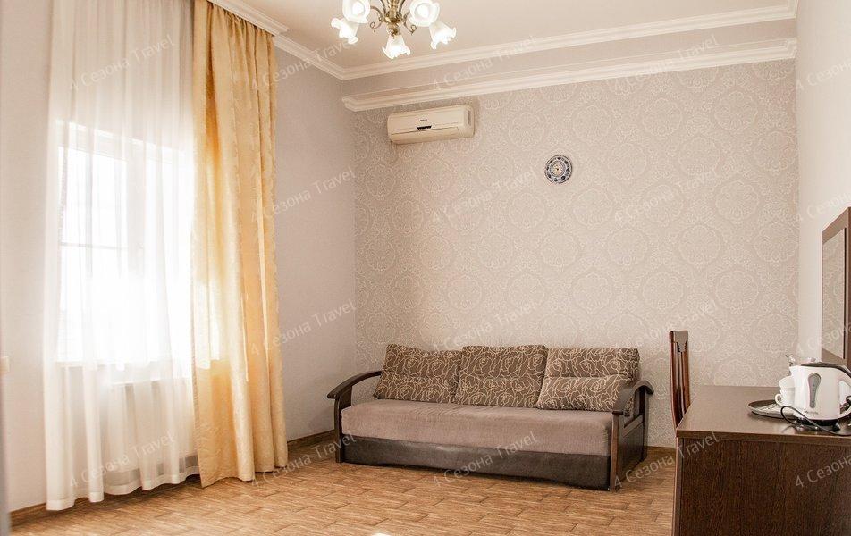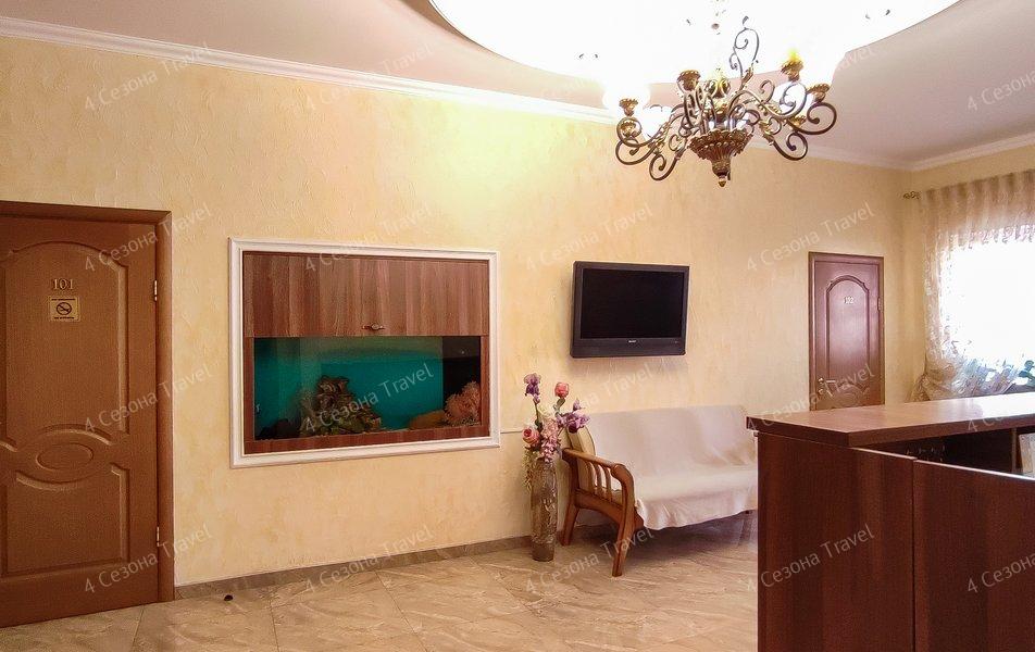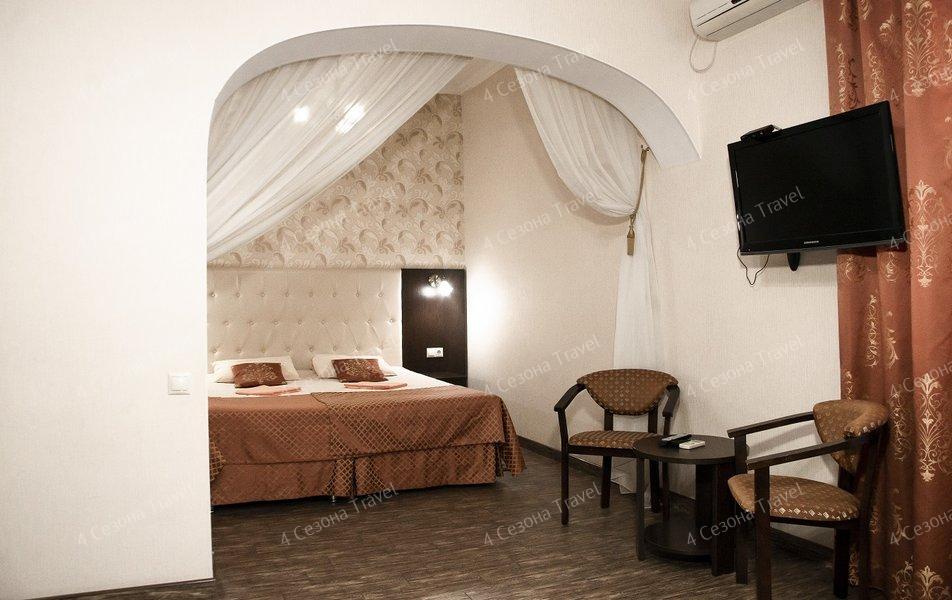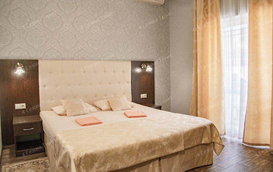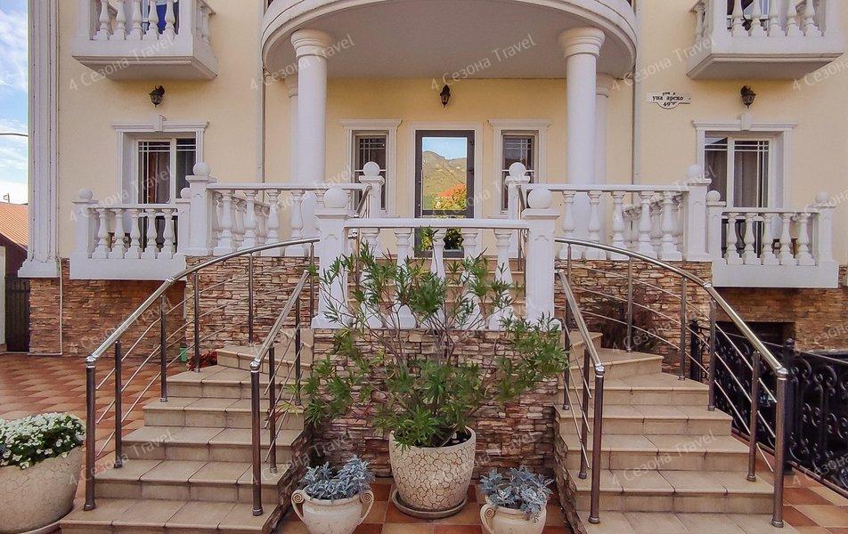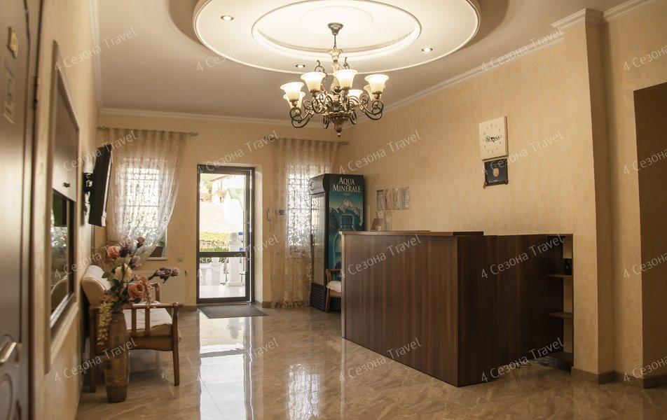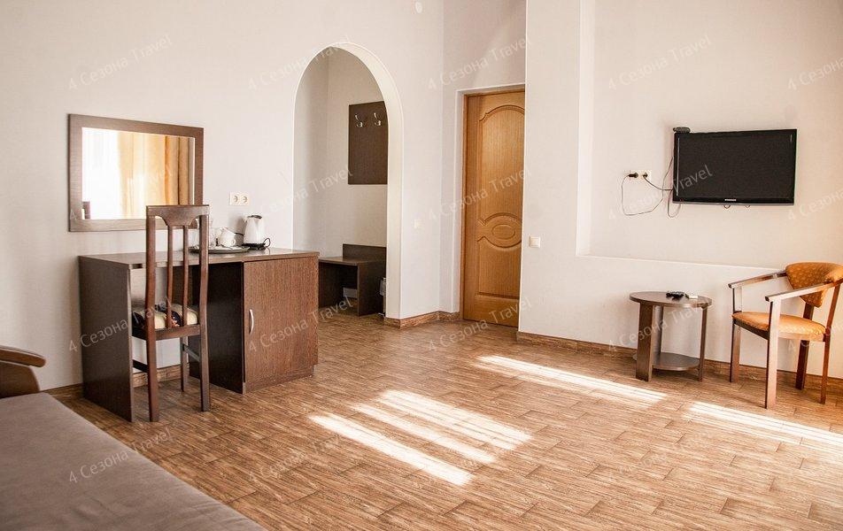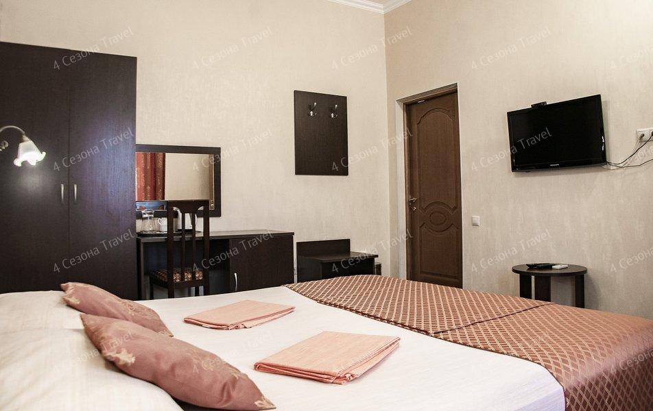 Трехэтажное здание с белоснежными балюстрадами разместилось на пересечении улиц Луначарского и Кирова. В распоряжении гостей номера разных категорий комфорта, есть как стандартные номера с балконами или террасами, так и просторные двухкомнатные апартаменты. В номерах есть санузел, душ, кондиционер, телевизор, электрочайник, холодильник.