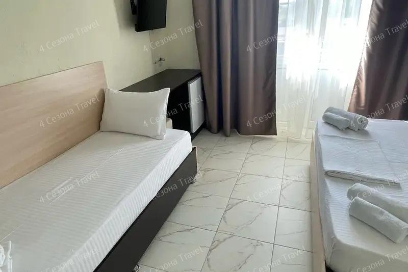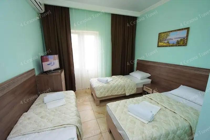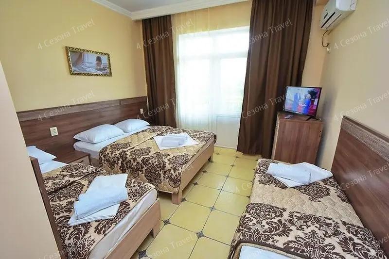 3-х местный Стандарт: односпальные кровати или двуспальная и односпальная кровати, прикроватные тумбочки, кондиционер, мини-холодильник, телевизор, шкаф, зеркало, санузел в номере.