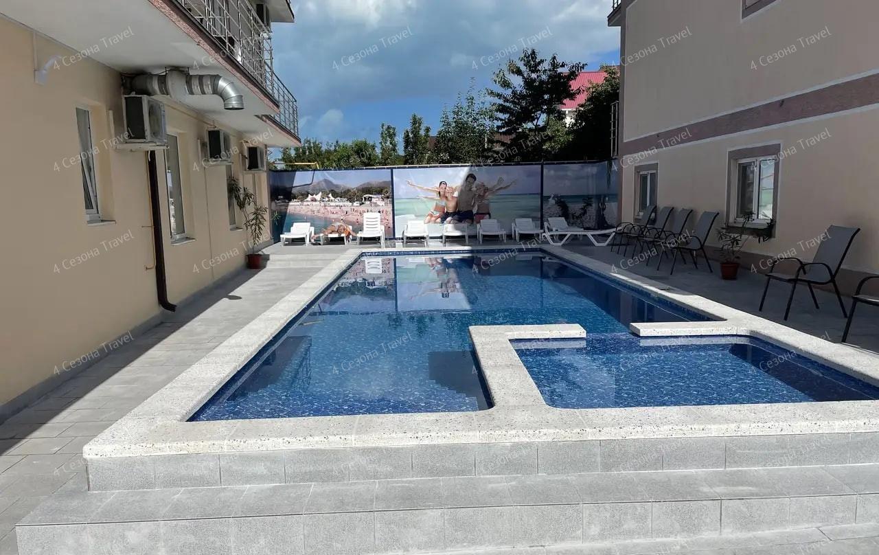 Инфраструктура: бассейн с детской зоной, площадка для загара с шезлонгами, столовая, кухня, батут
