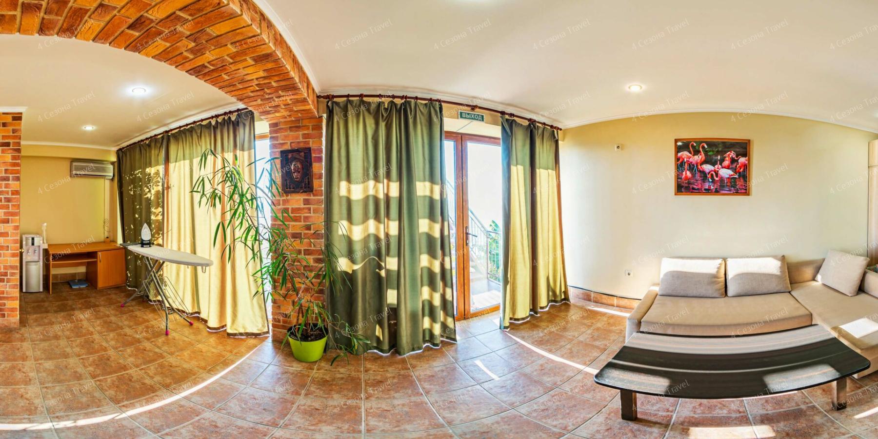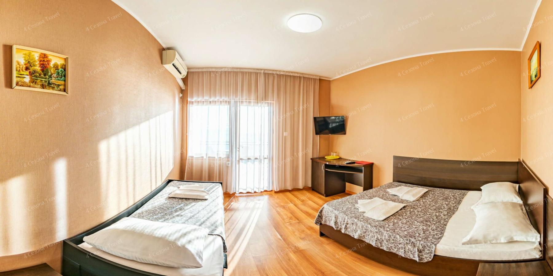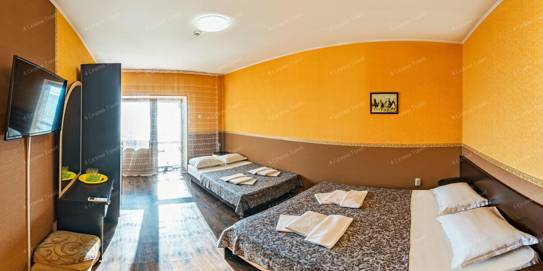 Небольшой четырехэтажный корпус находится на благоустроенный территории всего в 50 метрах от моря. Комнаты хорошо оснащены и укомплектованы: везде есть кондиционер, индивидуальный санузел, бытовая техника, балконы. Некоторые комнаты дополнительно оборудованы мини-кухней.
