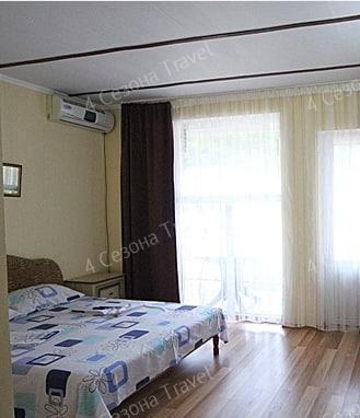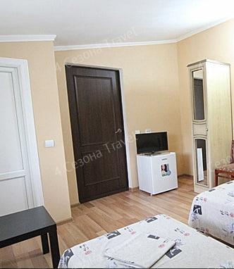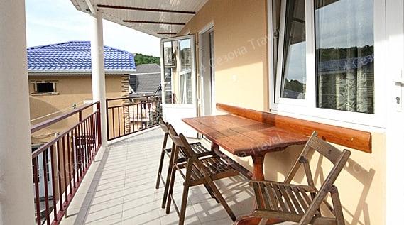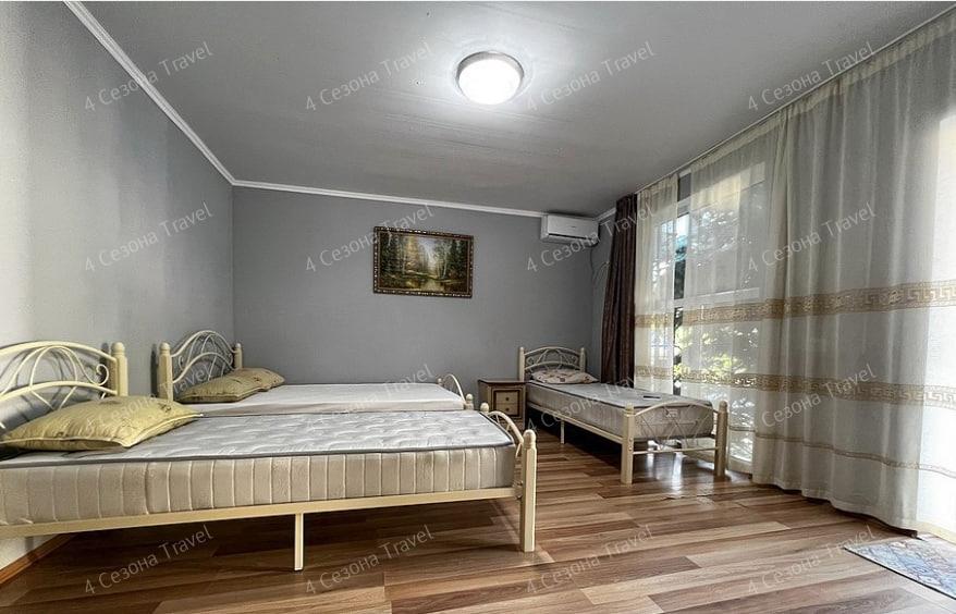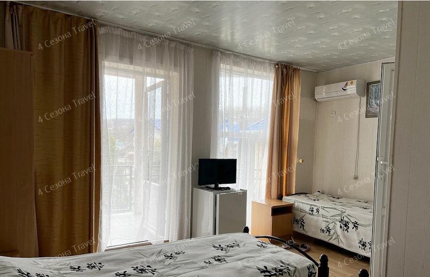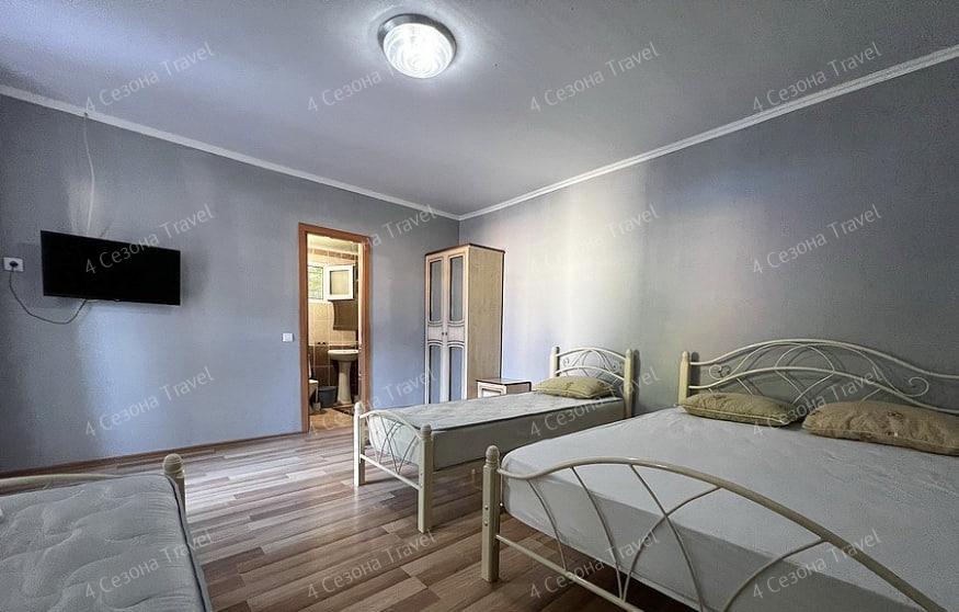 3-х местный Комфорт: двуспальная и односпальная кровати, прикроватные тумбочки, шкаф, телевизор, кондиционер, холодильник, санузел в номере, столик и стулья на террасе возле каждого номера