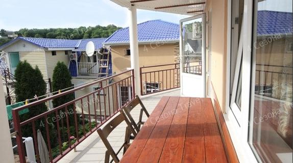 4-х местный Комфорт: двуспальная и односпальные кровати, прикроватные тумбочки, шкаф, телевизор, кондиционер, холодильник, санузел в номере, столик и стулья на террасе возле каждого номера