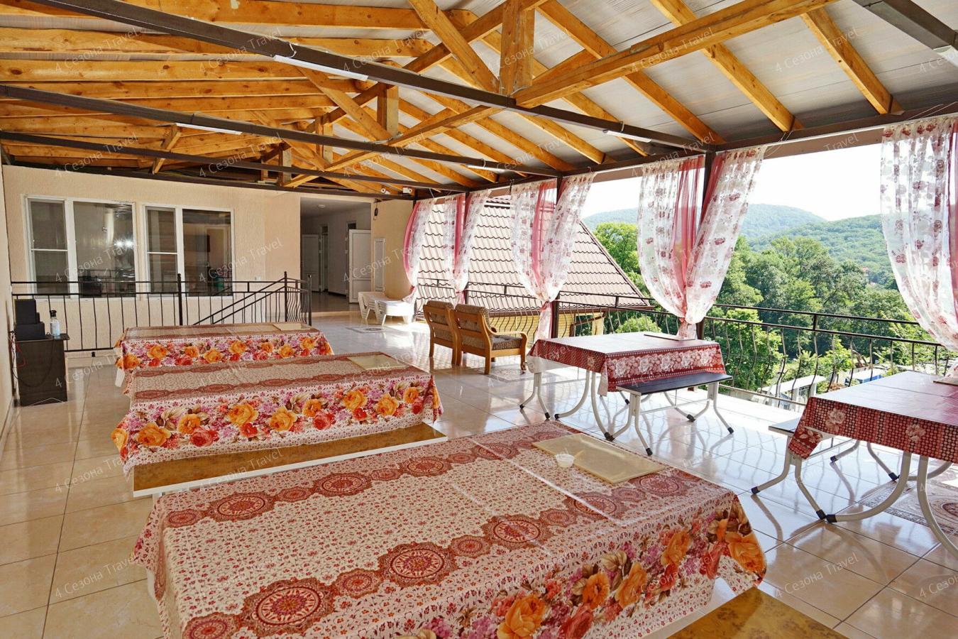На территории предусмотрены открытый бассейн с лежаками, общая кухня-столовая, а на большой веранде организована мангальная зона с видом на море.