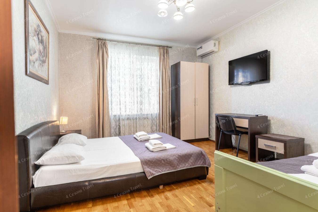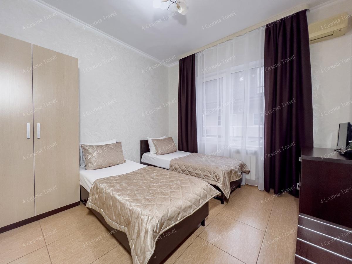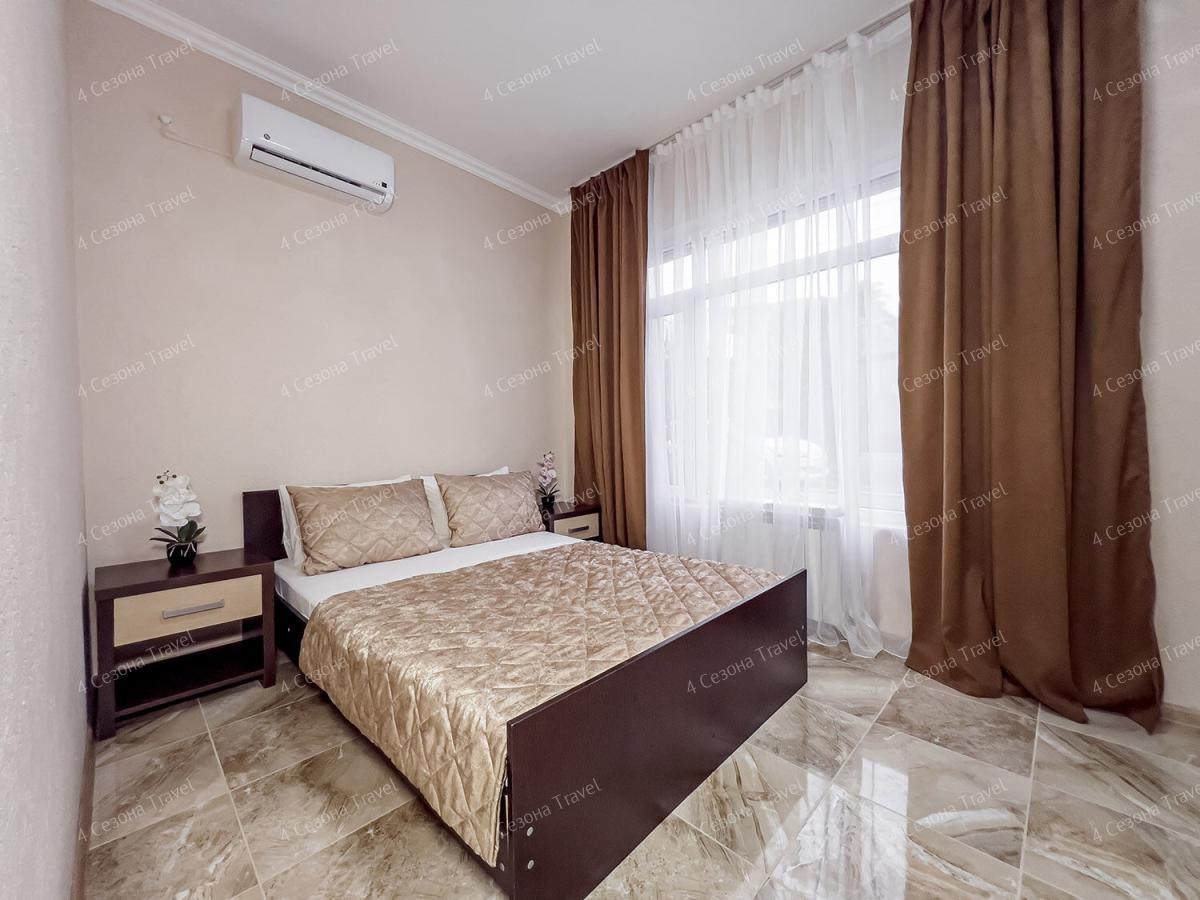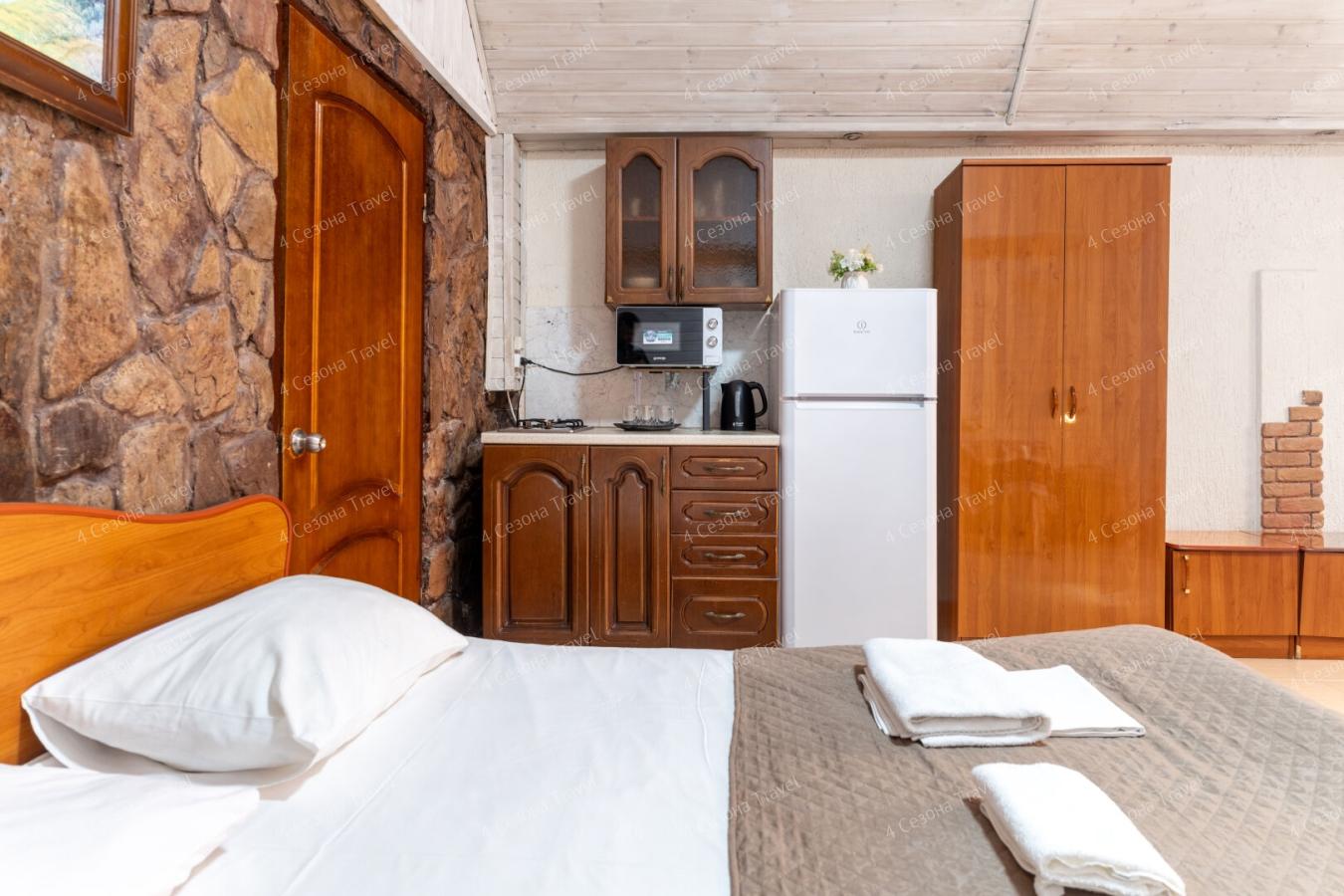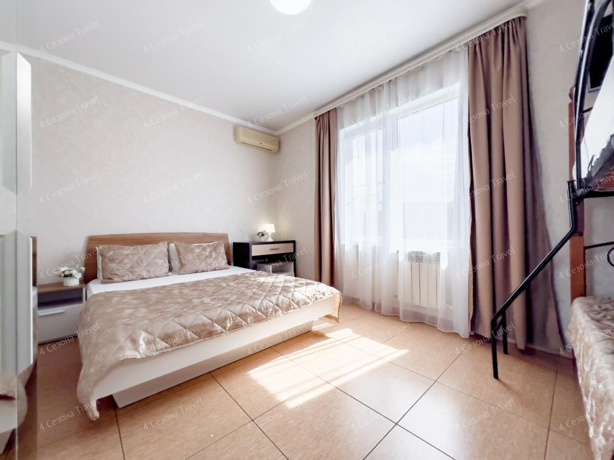 Номера современные, просторные. В комнатах есть все для отдыха – мягкая мебель, шкаф для одежды, телевизор, кондиционер, Wi-Fi, предоставляется постельное белье. Собственная ванная комната оборудована душевой кабиной, также есть номера с удобствами на этаже, есть полотенца, фен. Питание организовано в общей кухне, где гости могут самостоятельно приготовить еду. Дополнительно можно заказать блюда и напитки в номер, в непосредственной близости от гостевого дома есть кафе и столовые.